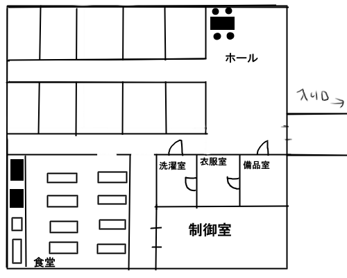 そうね。ホールの左に並んでるのが個室で、食堂と制御室、後は細々した部屋。 衣食住に困らない最小限ってところかな。 |